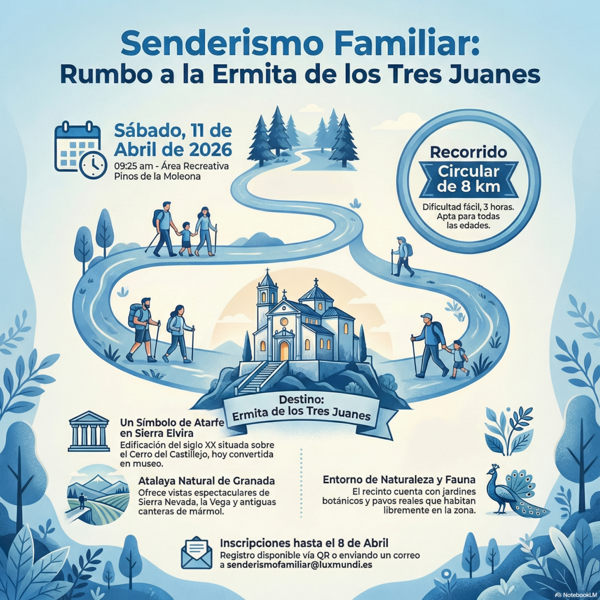 ¿Buscas plan para el próximo 11 de abril de 2026? Únete a nuestra ruta de Senderismo Familiar con destino a la mítica Ermita de los Tres Juanes📍 Punto de encuentro: Área recreativa Pinos de la Moleona, Atarfe